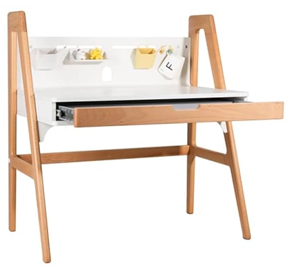 Необходимо выбирать столы с безопасной конструкцией: без острых углов (они должны быть закруглены), с прочной, устойчивой опорой (чтобы стол не переворачивался при активном использовании), а также из экологически чистых материалов (натуральное дерево, ламинированный МДФ/ДСП класса Е0 или Е1), которые не выделяют вредных веществ и безопасны для ребенка. Наличие специальных подставок для книг, тетрадей и учебников (например, выдвижных полок или прикрепленных книжных стоек) поможет организовать рабочее пространство, избежать беспорядка и обучить ребенка порядку. Также удобны модели с небольшими выдвижными ящиками для хранения канцелярии, школьных принадлежностей (например, фломастера, ручек, карандашей) и личных вещей ребенка — это позволит сохранить рабочую поверхность свободной и сосредоточиться на занятиях.